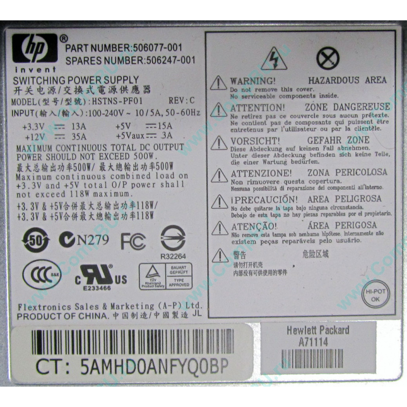 Корпус (case): серверный корпус HP (высота 1U), установлен блок питания 500W HP HSTNS-PF01 (p/n: 506077-001, s/n: 506247-001)